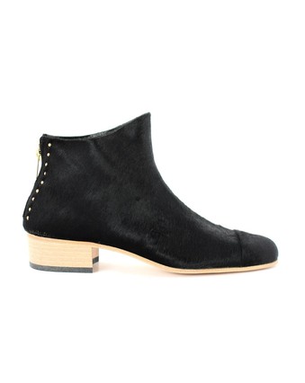 With black pony hair upper, a stacked wooden heel, gold stud detailing at the rear, and heavy duty zip fastening at the heel.
