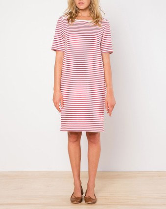 A demure length summer pull-on, knit dress to make spring time dressing a breeze, with 3/4 sleeves, boat neck with neck binding.